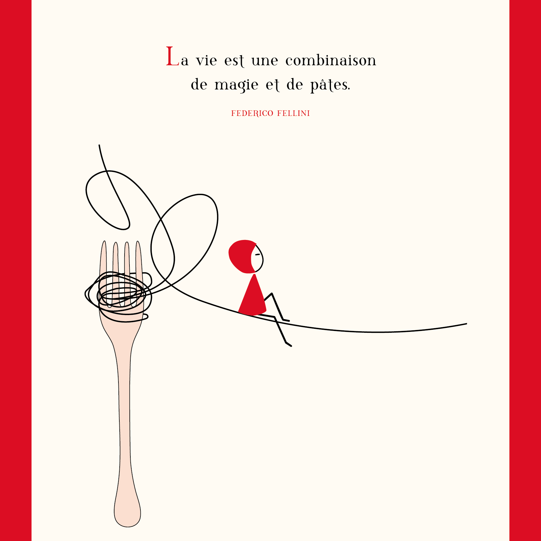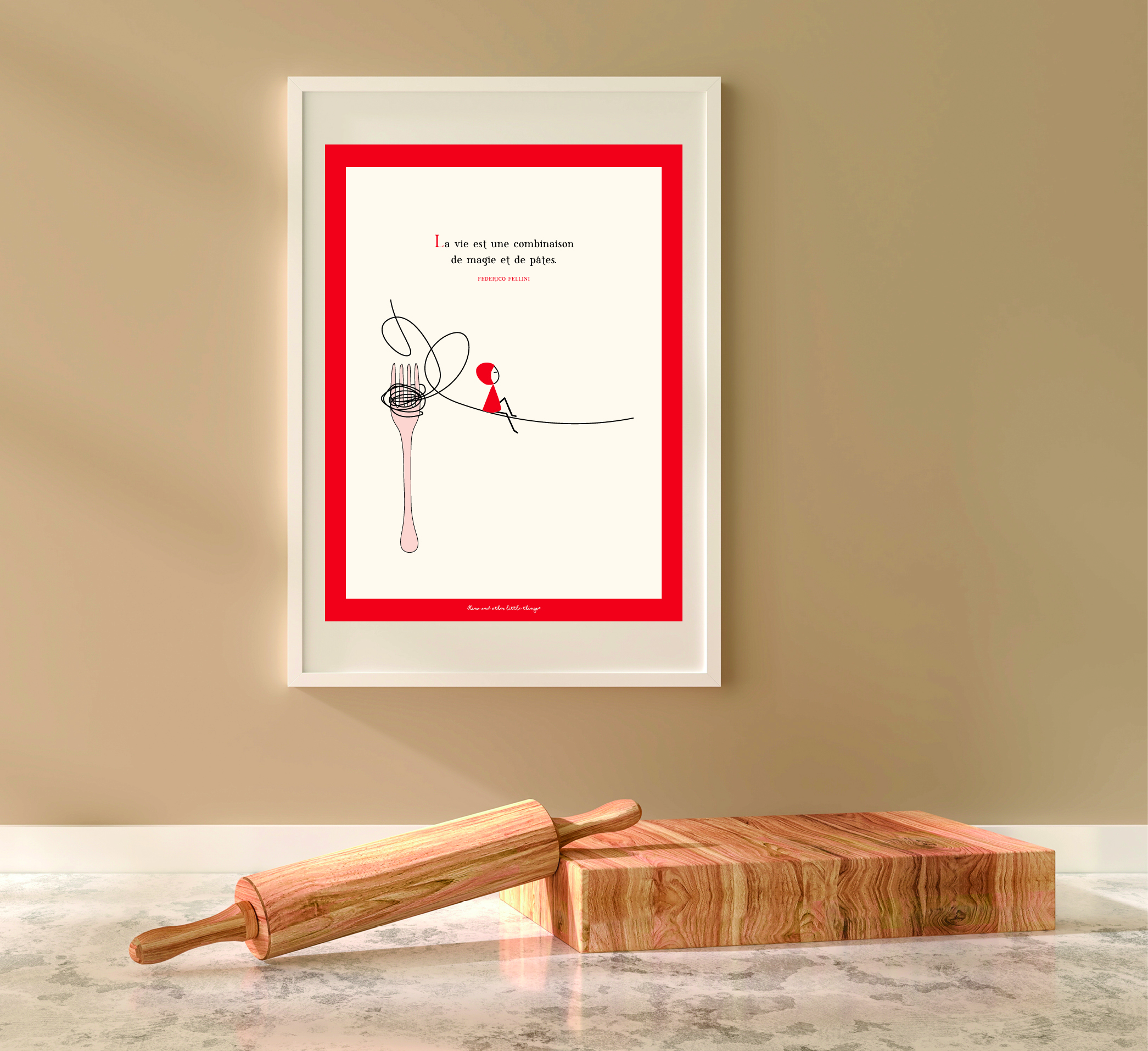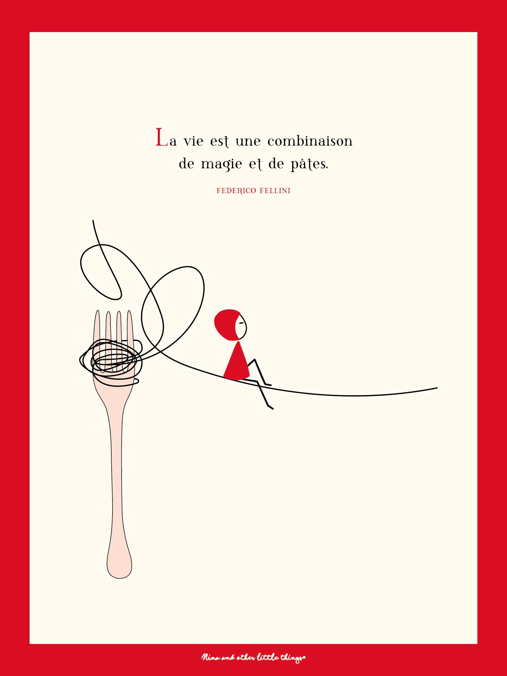 Affiche NINA avec la citation » La vie est une combinaison de magie et de pâtes » de Federico Fellini. Existe en 30×40 cm et 40×60 cm. Imprimée en France sur un papier premium.